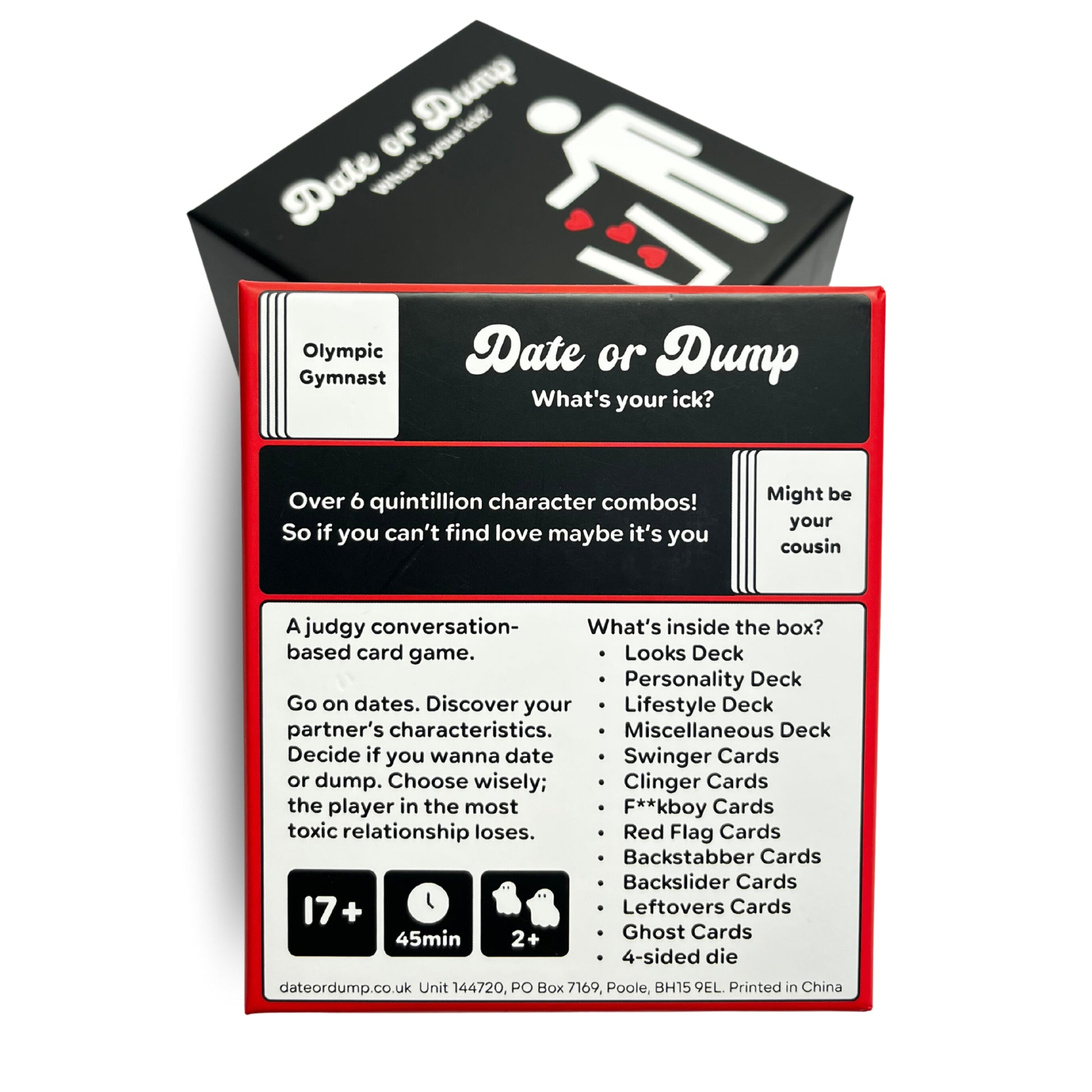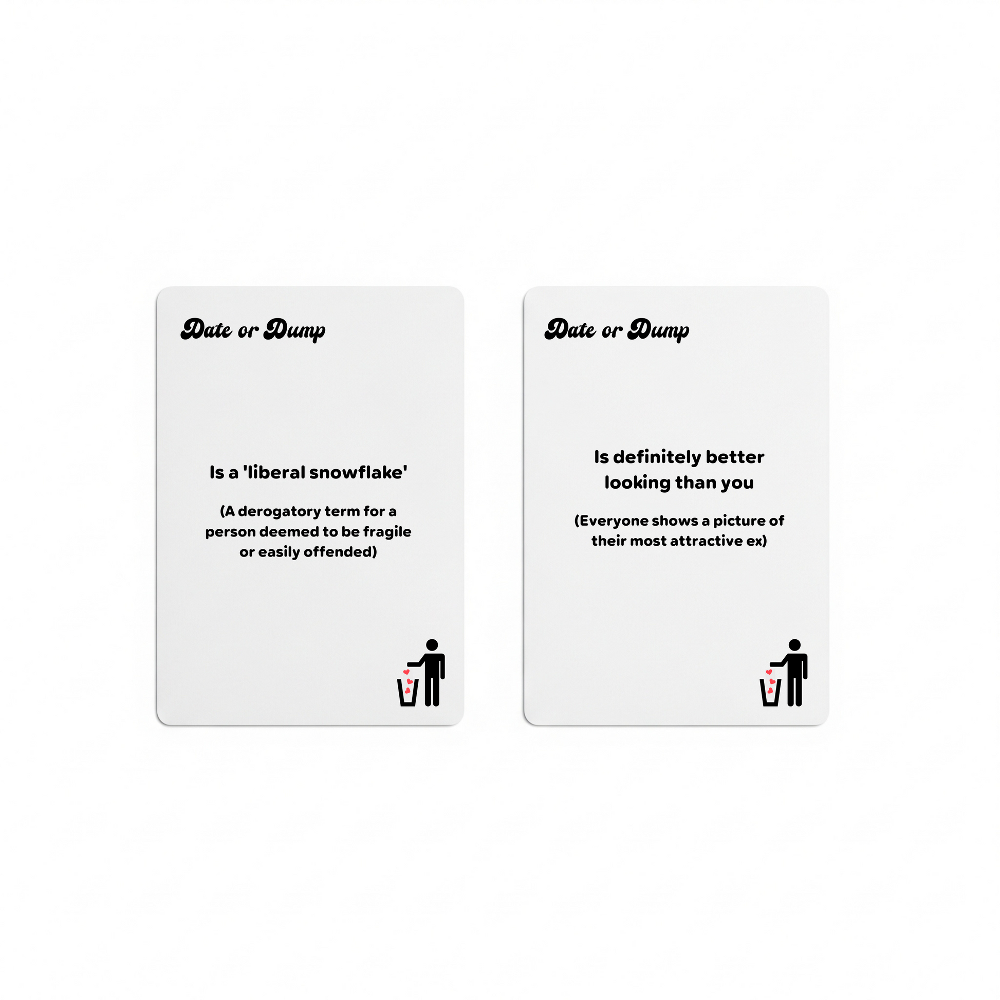 Go on dates. Each round is a week of dating. Discover new things about your partner each week. Decide if you wanna date or dump. Make sure you can convince other players you made the right decision. At the end of the game there's a vote. The player in the most toxic relationship loses.
